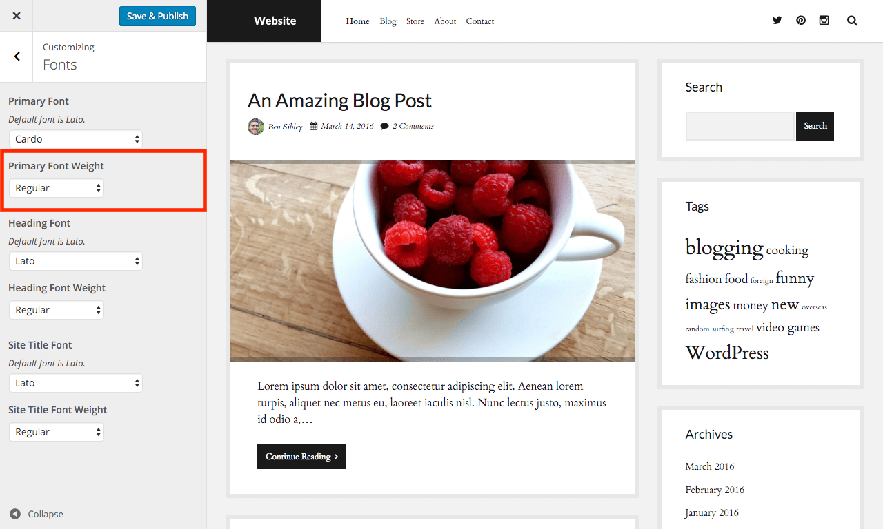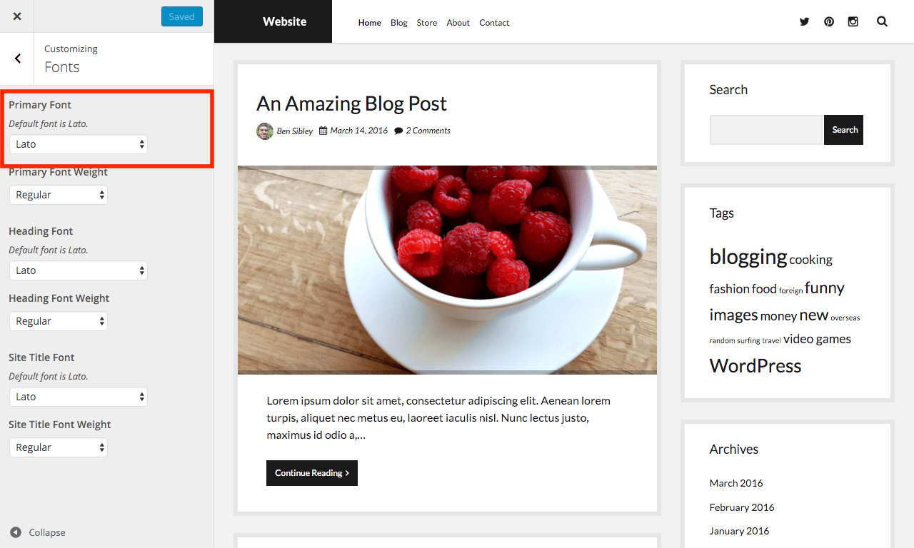 - Repeat the last two steps for the Heading Font and Site Title Font if you'd like to change them too