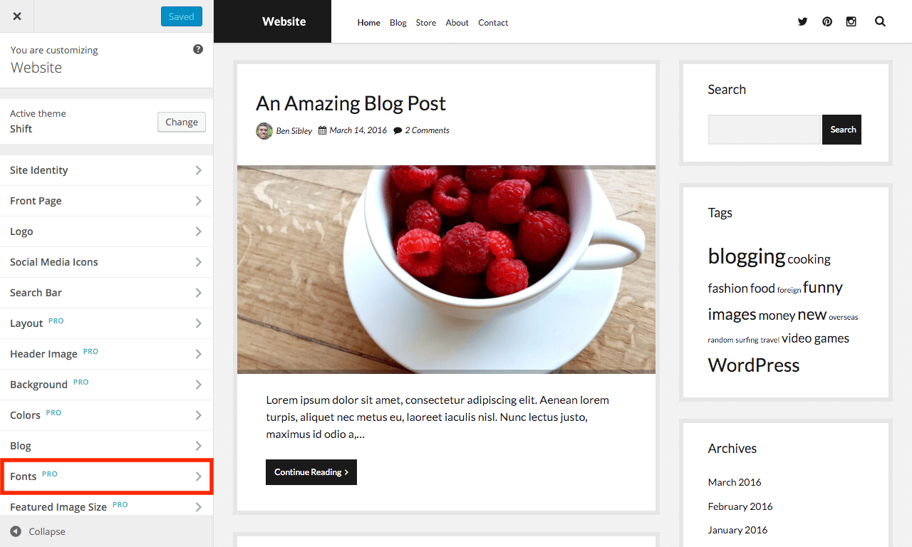 With Shift, you have 728 fonts to choose from. You can preview the fonts from the Google Fonts website , or via the Customizer.
