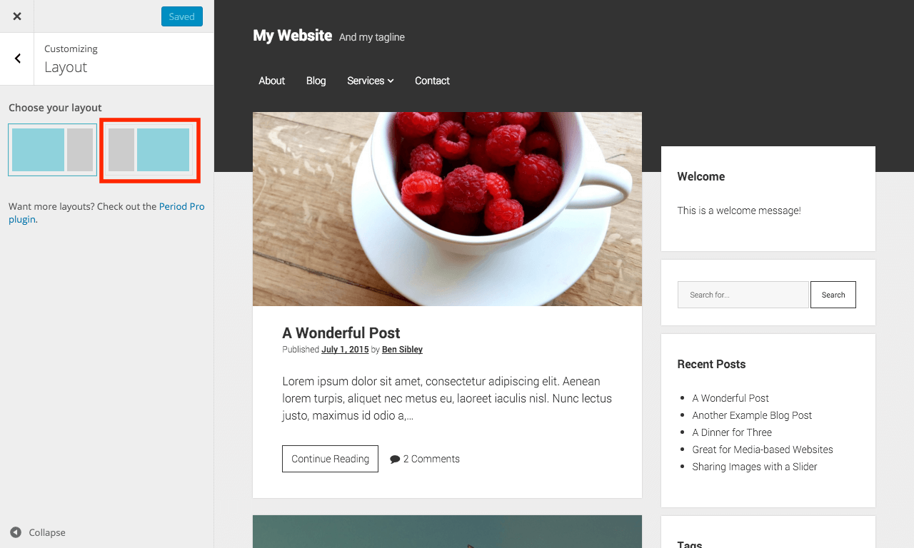 By default, Period displays a sidebar on the right-side of the site. You can switch the sidebar to the left-side using the Layout option.