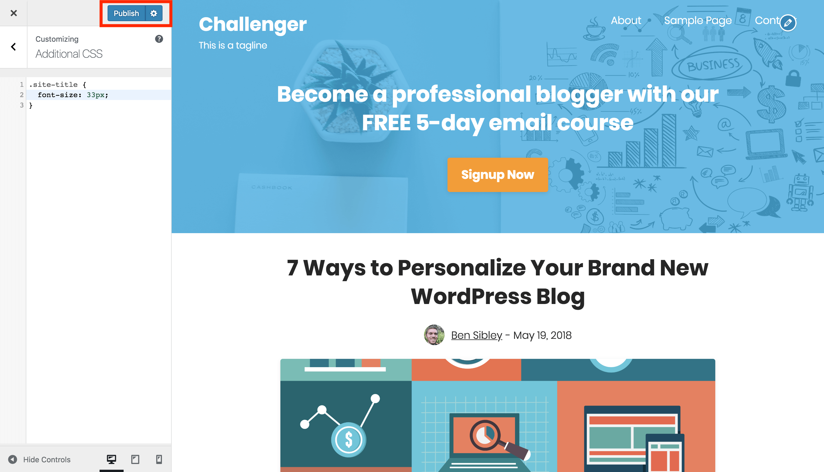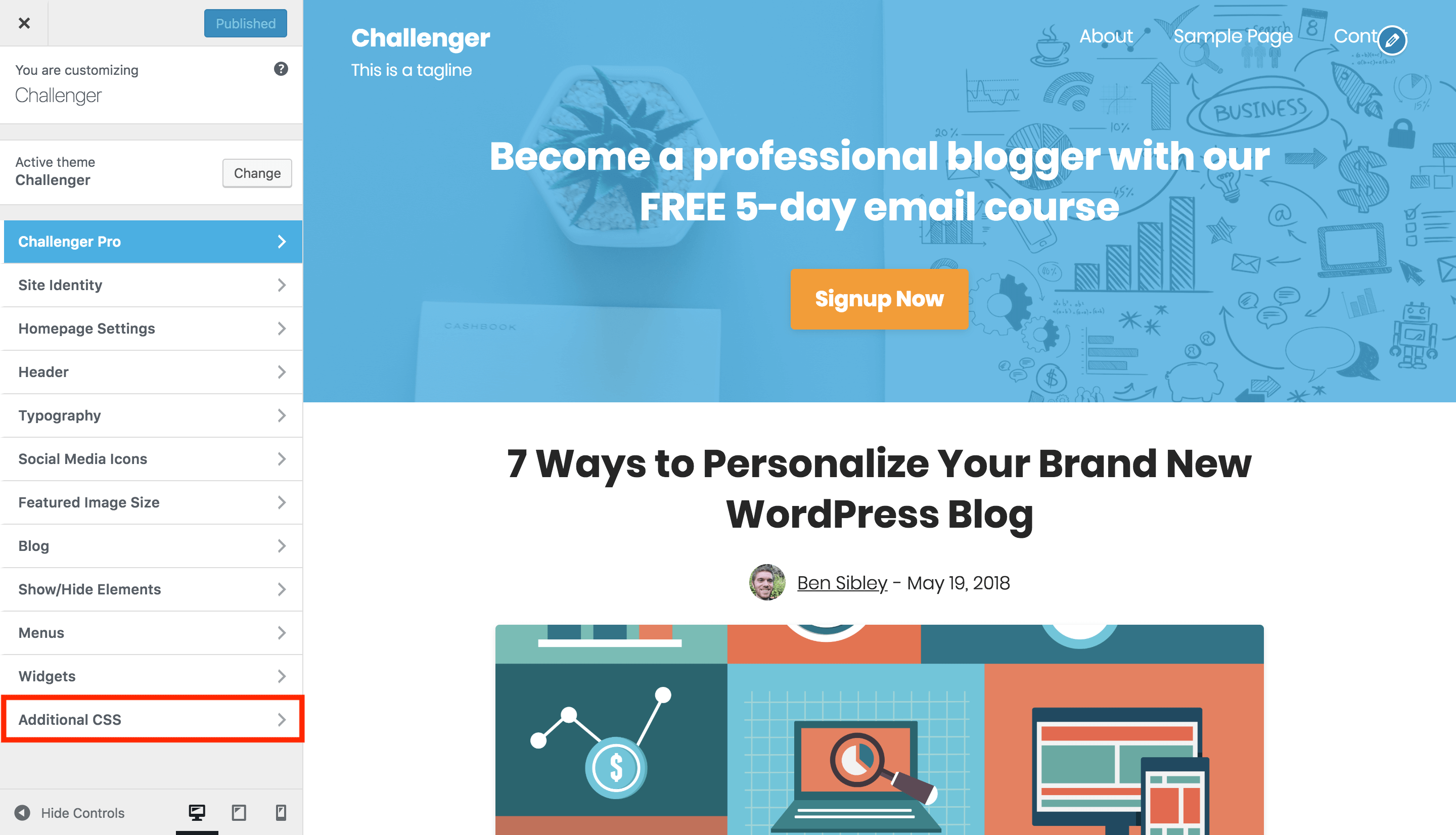 CSS can be used to customize the style of any element in Challenger. The easiest way to add your own CSS is with the Additional CSS section in the Customizer.