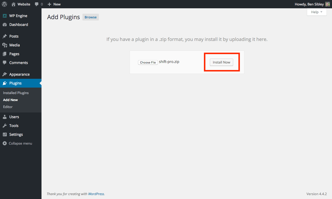 Shift Pro should be uploaded through the Plugins menu as described in the steps above.